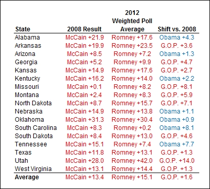 In 10 of 18 states the red grows redder — a polling lead for Mitt Romney that exceeds John McCain’s 2008 margin of victory. In the other seven, all still with Romney ahead, the redness has paled — a smaller Romney edge in polling now compared with McCain’s margin four years ago. The two states with the biggest shift blueward are South Carolina followed by Tennessee — the latter showing the red margin of advantage cut in half. And the polling data is pretty good in extent and quality: Silver’s weighted number for Tennessee relies mainly on two surveys: a YouGov poll earlier this month (finding Romney +8 among registered voters) and a Vanderbilt poll in May (Romney +7 among registered voters).
